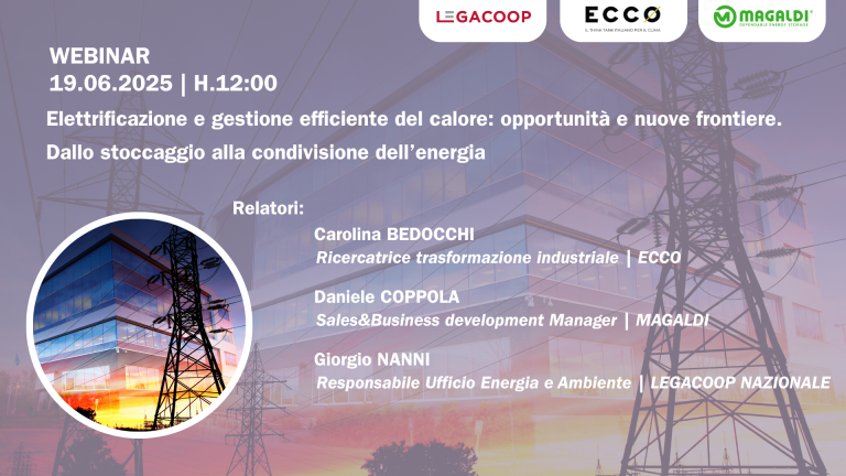WEBINAR “Elettrificazione e gestione efficiente del calore: opportunità e nuove frontiere. Dallo stoccaggio alla condivisione dell’energia” 12:00 – 14:0019 Giugno 2025 Si terrà giovedì 19 giugno il webinar organizzato da Legacoop, Ecco (think tank per il clima), Magaldi Green Energy dal titolo “Elettrificazione e gestione efficiente del calore: opportunità e nuove frontiere. Dallo stoccaggio alla … Leggi tutto WEBINAR “Elettrificazione e gestione efficiente del calore: opportunità e nuove frontiere. Dallo stoccaggio alla condivisione dell’energia”